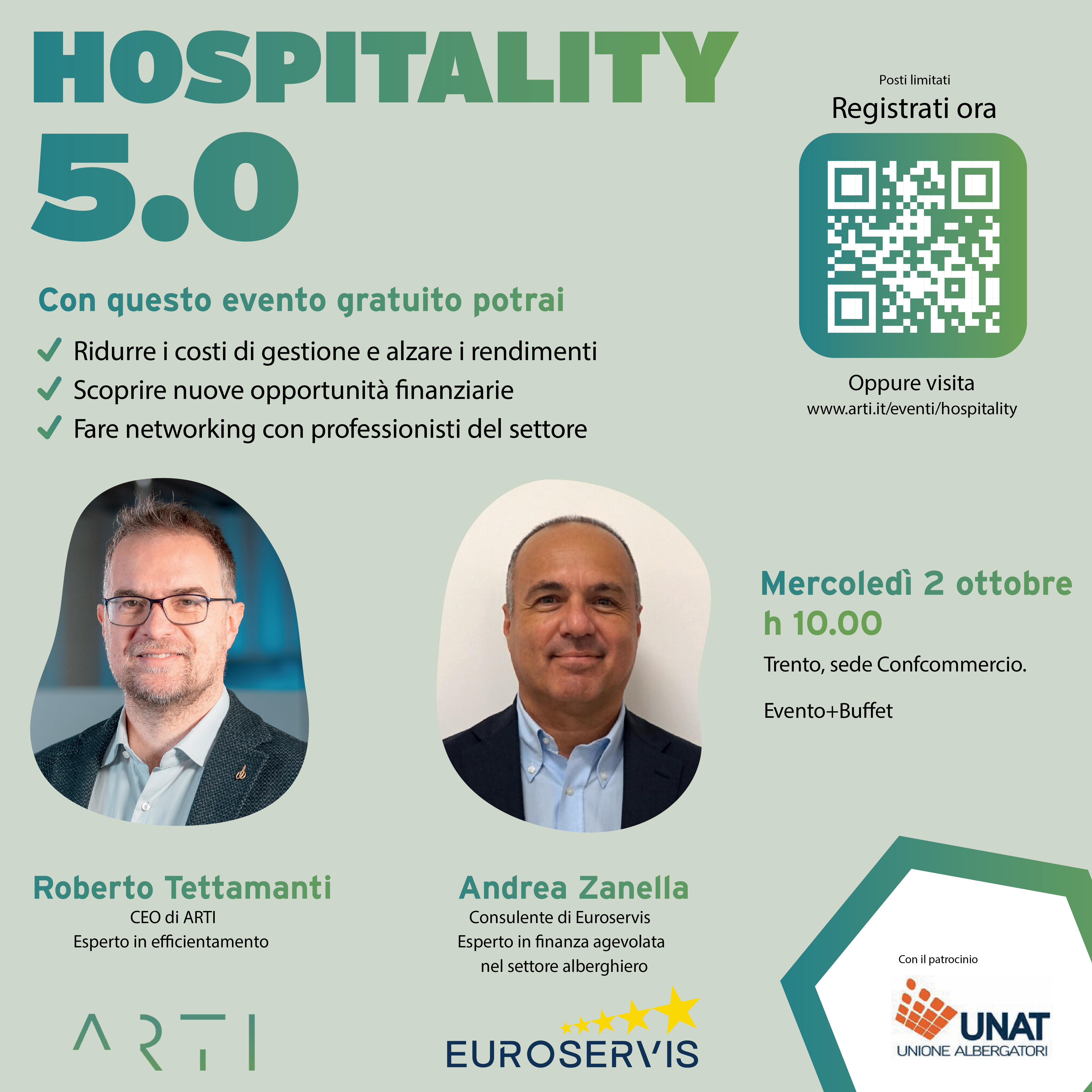 La partecipazione all’evento è gratuita, ma i posti sono limitati. Registrati ora per assicurarti un posto: Hospitality 5.0 – Evento gratuito per imprenditori del mondo ospitalità (arti.it).